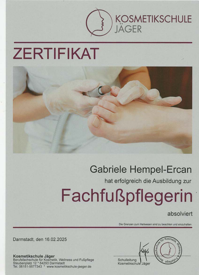 Dieser Wunsch, Menschen zu helfen und ihnen ein gutes Gefühl zu geben, hat mich schließlich dazu bewogen, diesen Traum zu verwirklichen. Mit großer Freude habe ich im Februar 2025 mein Zertifikat zur Fachfußpflegerin erhalten. Diese umfassende Ausbildung hat mein früheres Wissen vertieft und mich mit den neuesten Techniken und Standards vertraut gemacht.