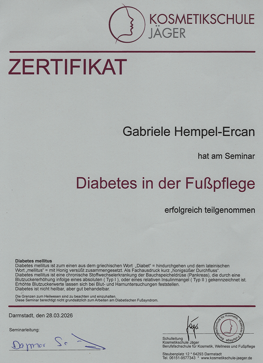 Eine fundierte Ausbildung bildet die Grundlage meiner Arbeit. Hier habe ich alle relevanten Kenntnisse erworben, um Füße fachgerecht zu beurteilen und Behandlungen sicher, schonend und präzise durchzuführen.